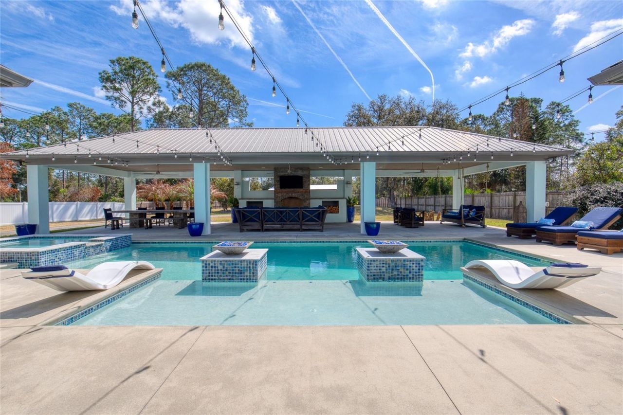 Welcome to 108 Pine Tree Drive, a stunning custom-built estate by Heritage Construction, perfectly positioned on 1.72 acres in one of the most desirable and centrally located areas of Ormond Beach. Offering 3,090 square feet of living space, this exceptional 4-bedroom, 4-bathroom, attached 3-car garage home blends refined craftsmanship, modern luxury, and resort-style outdoor living.From the inviting front porch to the grand 8-foot entry doors, quality and attention to detail are immediately evident. Inside, the home showcases 10-foot ceilings, wood-look tile flooring throughout, and a built-in speaker system designed for seamless everyday living and entertaining. A striking in-home saltwater aquarium creates a one-of-a-kind focal point that sets this residence apart.The luxury chef's kitchen serves as the centerpiece of the home, thoughtfully designed for both beauty and function. Features include a premium KitchenAid stainless-steel appliance package with double ovens, electric range, and built-in ice machine. Custom 42-inch soft-close cabinetry, an oversized granite island with additional storage, and an exquisite glass backsplash are complemented by custom oyster chandeliers that elevate the space with coastal elegance.The primary suite offers a true retreat, featuring a massive walk-in closet and a spa-inspired bathroom with dual marble vanities and abundant storage. Upstairs, a versatile fourth bedroom & bathroom, and a bonus room provide flexible living space, supported by a dedicated A/C system for optimal comfort.Designed for unforgettable gatherings, the backyard is an entertainer's dream. A covered 19 x 20 outdoor kitchen includes concrete countertops, grill, flat-top grill, stainless steel sink, refrigerator, and ice chest. The impressive 65 x 20 cabana with metal roof creates a private resort atmosphere complete with a wood-burning fireplace, outdoor TV, retractable shade panels, three ceiling fans, outdoor shower, and a custom 13-foot concrete table overlooking the heated saltwater pool. Expansive paved driveway completed in 2024, upgraded landscaping, and a large front lot enhance both functionality and curb appeal, while the property extends beyond the fenced area for additional space and flexibility.In addition to the attached three-car garage, the property features a remarkable 70 x 50 insulated garage ideal for car collectors, RV owners, hobbyists, or multi-generational living. This versatile structure includes three 12' x 14' doors, one 12' x 10' door, and one 12' x 8' door, and is already plumbed for a future bathroom, offering exceptional potential for conversion into a detached guest house or true in-law suite.Additional highlights include a saltwater-heated pool, brand-new metal roof on the home, 2022 kitchen appliance package, 2026 hot water heater, dual A/C systems installed in 2017 including a dedicated upper-level unit, 2025 water treatment system, and 2024 paved driveway. This one-of-a-kind property delivers the rare combination of luxury, land, and lifestyle in a private estate setting just minutes from shopping, dining, and beaches. All information recorded in the MLS is believed to be accurate but is not guaranteed. Buyers are advised to conduct their own due diligence to verify the information provided.