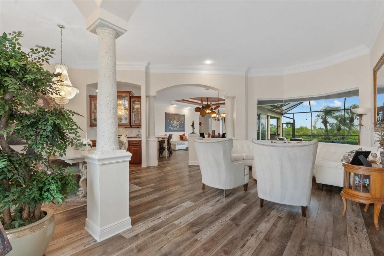 Welcome to Riviera Dunes, one of Southwest Florida's premier boating communities and home to the region's safest deep-water harbor. Perfectly positioned along the peaceful Manatee River, this neighborhood offers direct access to the Gulf in just 10 minutes. Tucked behind the private gates, the home greets you with lush landscaping and a welcoming entryway. Inside, you'll find an updated interior with luxury vinyl plank flooring that flows effortlessly through the living and entertaining spaces. The open kitchen is beautifully appointed with stainless steel appliances and connects seamlessly to the family and dining areas, making gatherings a breeze. Designed with flexibility in mind, the home features two full master suites and two additional guest bedrooms. The upstairs master is a true retreat complete with a walkthrough closet, coffee bar with sink, luxurious spa-style bathroom, and a tranquil balcony where you can sip your morning coffee while watching marine life below. Perfect for entertaining, the expansive sliding atrium doors disappear to create a seamless connection between indoors and outdoor spaces. Step outside to your sparkling heated pool and fully equipped summer kitchen-ideal for year-round Florida living. Additional highlights include a three-car garage, whole home water filtration system and a new AC unit. Enjoy access to outstanding community amenities, including a clubhouse, fitness center, tennis, pool, and an active pickleball community. This is more than a home-it's a lifestyle. Welcome to your private waterfront retreat in Riviera Dunes.